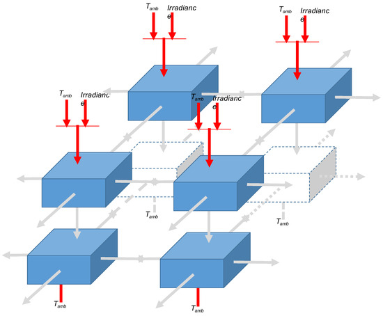 The PV cell model comprises interacting thermal and electro-thermal components. The thermal model assumes uniform heating from irradiance and electrical activity, using R-elements () for heat distribution and a C-element for volume, defined by material properties (specific heat c, density ) and dimensions (). The electro-thermal model (Figure 1), validated against one-diode models [16], includes a diode (), parallel resistor (), and series resistor (), with thermal effects via RS-elements. Cell current is , where reflects irradiance and temperature effects (see Appendix B for equations).