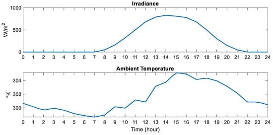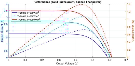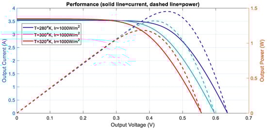 Using real 24-h data [17] (Figure 3), simulations confirm power proportionality to irradiance (Figure 4) and inverse proportionality to temperature (Figure 5), aligning with [18,19]. While our validation is based on synthetic data aligned with known physical behaviors, future improvements could involve hardware-in-the-loop setups for more realistic validation [20].