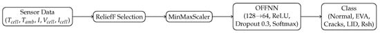 Workflow of the root-cause classification pipeline. Raw sensor data are preprocessed, with relevant features selected via ReliefF, and fed into an optimized feed-forward neural network (OFFNN) for degradation mode identification.