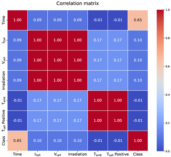 Correlation matrix of the selected features, highlighting the interdependence between sensor variables such as cell temperature, irradiance, and current.