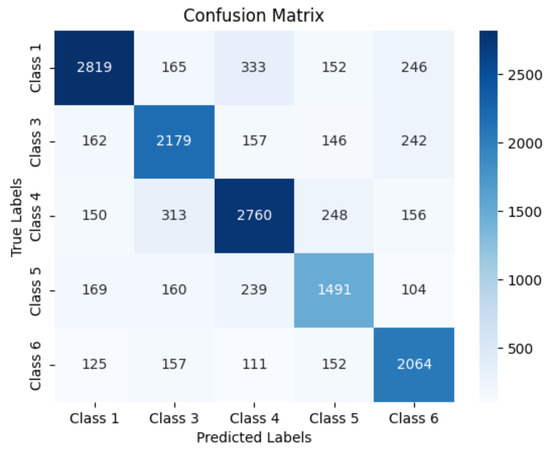 Confusion matrix showing classification results across the five classes. Numerical labels are retained for consistency with the original model output. Note: The confusion matrix in the figure uses numerical class indices due to consistency with the classification model’s training labels. For improved clarity, the corresponding degradation types are as follows: Class 1—Normal; Class 3—EVA Discoloration; Class 4—Cracks; Class 5—LID; and Class 6—Corrosion. These mappings are also reflected in Table 3, which presents performance metrics using descriptive labels.