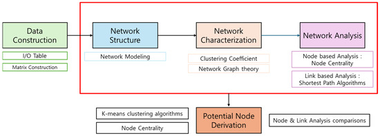 The methodology that we used is illustrated in Figure 1. In the data construction phase, a basic network structure was established, represented by inter-industry transaction volume matrices among industries using the I/O table. The network analysis phase consisted of the following stages: network modeling, network definition, and analysis through indices. In the network modeling phase, a set of nodes and edges was selected based on a volume matrix based on I/O tables. In the network defining phase, network analysis was conducted based on the clustering coefficient. In the final phase, we derived and compared latent nodes based on the concept of shortest distance through the traditional centrality index and the link analysis that we proposed.