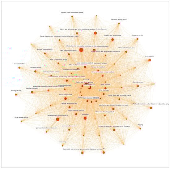 They were set as a weighted graph as they was based on inter-industry transactions. The clustering coefficient was 0.90, which is high and indicates a strong level of connectivity between a specific industry and its neighboring industries. In other words, Korea’s industrial structure network can be considered a small-world network, characterized by a high level of interdependence among industries [38]. Examples of small-world networks include academic and informational, economic, biological, technological, and social networks.