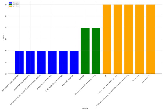 In this study, K was set to 3, and related industries were grouped into primary, secondary, and tertiary categories. The silhouette analysis showed that the silhouette score was high at 0.704 when the number of clusters was set to 3. This suggests that each cluster was well-formed and clearly separated, indicating that k = 3 effectively captured the structure of the data.
