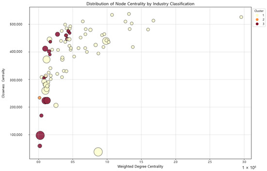 Figure 4 shows the distribution of node centrality metrics by industry classification. The X-axis represents weighted degree centrality, indicating the strength of connections for each node. The Y-axis represents closeness centrality, showing the accessibility of each node within the network. The size of the points reflects betweenness centrality and the colors represent industries (1st: yellow, 2nd: orange, 3rd: red). Each cluster in the visualization corresponds to a distinct industrial group. For example, Primary industries include logistics and transportation, Secondary industries involve manufacturing and steel, and Tertiary industries cover areas such as IT services and finance.