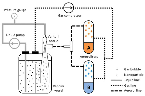 In Figure 1, a scheme of the comprehensive experimental setup relying upon ultrasonic aerosolisation is reported. The overall setup components are as follows: