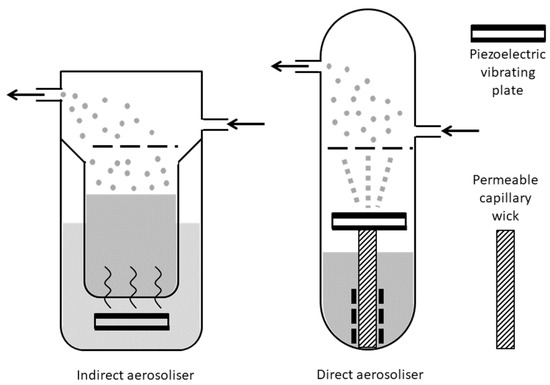Schematic diagram of two different devices for liquid nebulisation. The left figure refers to an indirect atomization technique, while the right one refers to a direct atomization method. The liquid in the cavity of the indirect aerosoliser has the sole function of transmitting the vibrations produced by a piezoelectric transducer.