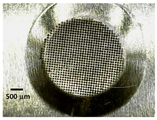 In Figure 3, the differences between the two mentioned nebulisation techniques are highlighted. In an indirect aerosoliser, a submerged piezoelectric plate, oscillating at a constant resonance frequency, produces vibrations in a volume of water acting as an auxiliary fluid, which, in turn, transmits these vibrations to the meniscus of a separated liquid phase where a reagent is dissolved, giving a stream of aerosolised droplets. The auxiliary liquid has the sole function of energy transfer between the piezoelectric transducer and the liquid subject to aerosolisation, which is located in a thin-wall polymeric vessel surrounded by the auxiliary liquid. On the other hand, a direct aerosolisation technique relies on direct contact between an oscillating metal plate and a liquid containing a reagent, without resorting to an auxiliary fluid acting as an energy vector. In particular, the liquid containing a reagent is placed in a container, where a wick is located in the middle, which imbibes by capillarity, bringing the liquid into contact with the vibrating metal plate. The latter, 16 mm in diameter, has a finely perforated central area, 3.5 mm in diameter, which is permeable to the solution. The latter is thus finely atomised, producing a stream of droplets containing a reagent. An enlarged image of the micro-holes on the vibrating lamella is shown in Figure 4.