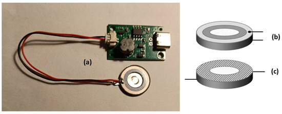 In Figure 5a, a photograph of the ultrasonic atomiser driver circuit, connected with the atomiser plate, is reported. The operating tension is 5 V, with a power input of 2 W and a resonant frequency in the range 103–113 kHz. The frequency transducer, namely the atomising device, acts as a capacitor and consists of two metallic plates separated by a dielectric layer. The upper plate is shaped in the form of a circular crown, while the lower one has a central pitted area, as previously said.