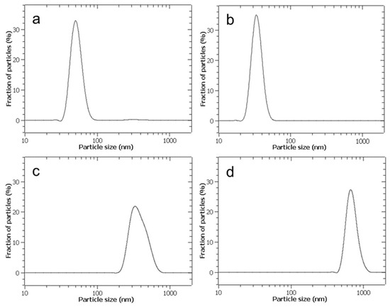 Plot of particle diameter distribution function obtained by DLS. (a) Direct aerosolisation with CaCl2 and Na2CO3 at concentration C0 = 0.472 [M]. (b) Direct aerosolisation, but with reagent concentrations C0/4. (c) Reagent mixing in stirred tank reactor, with impulsive injection of reagents at concentrations adopted in (a). (d) Reagent mixing in stirred tank reactor, with impulsive injection of reagents at concentrations adopted in (b). Curves are interpolations from frequency histograms derived from averages over three replicate samples, with a maximum experimental error not exceeding 10%.