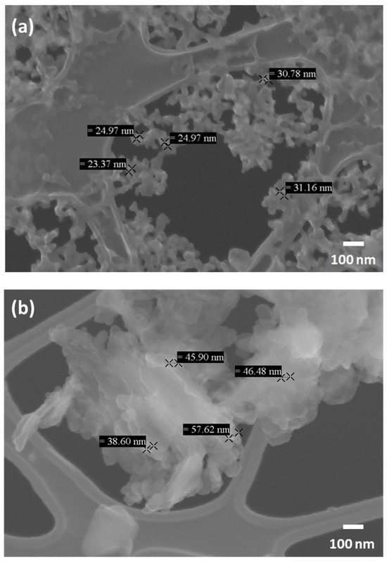 In Figure 7, FESEM images of the NP aggregates obtained by direct aerosolisation at two different values of precursor concentration, namely C0 and C0/4, are reported. By simple inspection, the dimension of primary particles is qualitatively consistent with the DLS results.