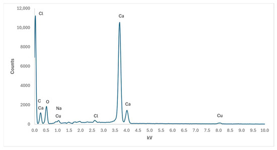 In Figure 8, the energy-dispersive X-ray spectroscopy has been carried out for the solid phase obtained by the aerosol-assisted method, with reagent concentrations equal to those adopted in Figure 7a. Although the analysis has been carried out up to 20 kV, the horizontal axis has been intentionally cut at a maximum of 10 kV in order to improve the resolution of visible peaks, especially since no other significant peaks were detected for values greater than 10 kV. The presence of Cu is due to the FESEM metal substrate on which the nanostructured phase was deposited, while Na and Cl ions are accessory ions present in both precursors and forming NaCl according to reaction (1). The measured atomic ratio Ca/C = 0.815 is different from the expected value Ca/C = 1, corresponding to a solid phase made of pure CaCO3. This result can be ascribed to an excess of C related to the presence of a thin graphitisation layer deposited on the solid phase to make it conductive, according to the preparatory technique required by FESEM analysis. The composition of the NPs obtained in other experimental configurations proposed here does not differ significantly from those of Figure 8, and hence it has not been reported.