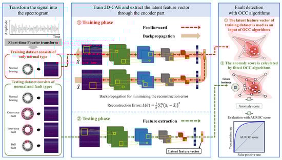 In the current study, we first transformed the raw time-domain vibration signal into a spectrogram using the STFT technique in order to represent both time and frequency characteristics. Then, the 2D-CAE was trained to embed the spectrogram into a much smaller latent feature vector. These latent vectors can be obtained by passing through several convolutional blocks within the encoder part of the 2D-CAE, and thus, the encoder of the CAE structures can be used as a feature extractor. Finally, by solely using the extracted latent feature vectors of the normal signals, fault detectors were trained by OCC algorithms, and the fault detector determined whether newly collected signals were generated from a normal state. To demonstrate the efficacy of the proposed fault detection framework, we used the rolling bearing experimental platform, which generates the vibration signals with accelerometer sensors. The comparative experiments demonstrated that our proposed framework achieved the highest AUROC score for bearing fault detection based on vibration signals. In this study, we released whole source codes to implement the experimental studies in the open-source repository (https://github.com/BAP-SAE/FD_CAE_Spectrogram; accessed on 6 July 2025). We believe that this uploaded source code can guarantee the reproducibility and replicability of the proposed fault detection framework with the spectrogram and 2D-CAE model.