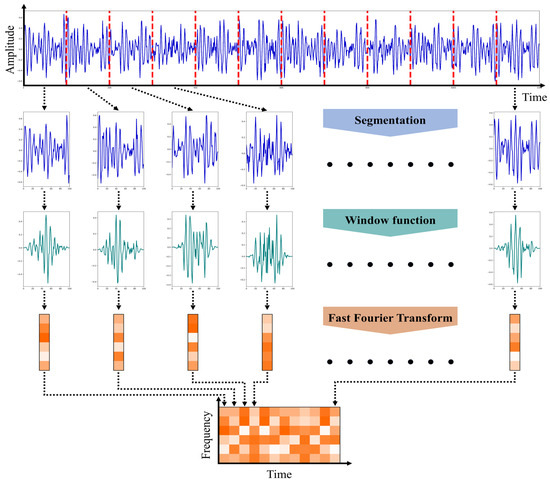 To derive the frequency information from raw time-domain signals, Fourier transform-based techniques can be adopted [60,61,62]. Among these Fourier transform-based techniques, a short-time Fourier transform (STFT) can be used to deal with the nonstationary signals. The STFT is the most widely used signal processing method for nonstationary signal analysis by capturing localized frequency properties from the signal. The STFT procedure is depicted in Figure 2. The STFT method first divides the signal into smaller consecutive segments, assuming that the signal might be locally stationary within a short time interval. However, the discontinuity at either end point of a split signal may result in the spectral leakage problem, in which the power at one frequency component erroneously leaks into other frequency components [63].