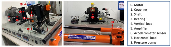 In this study, we collected vibration signals from our own rolling-element bearing experimental platform presented in Figure 3.