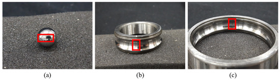 Experimental bearings demonstrating (a) a ball element fault, (b) an inner race fault, and (c) an outer race fault. The faults generated through EDM are displayed in the red boxes.