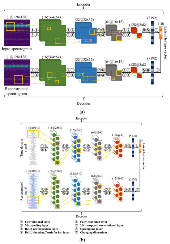As shown in Figure 5a, the encoder structure of 2D-CAE consists of four convolutional blocks, and each block comprises a convolutional layer, a max-pooling layer, a batch normalization layer, and an activation function. These convolutional blocks sequentially generate feature maps, and feature maps obtained from the fourth convolutional block are connected to the fully connected layer. In the fully connected layers, a latent feature vector with a length of 10 is derived to represent the intrinsic properties of the spectrogram. In the decoder structure, symmetric with the encoder structure, the latent feature vectors are reconstructed in the input spectrogram. In other words, the decoder structure consists of four transposed convolutional blocks substituting the convolutional and max-pooling layers of the encoder structure with the transposed convolutional and up-sampling layers, respectively. In contrast to the spectrogram, the features of single-domain-represented signals (time-domain- and frequency-domain-represented signals) are extracted through the 1D-CAE. As depicted in Figure 5b, the architecture of 1D-CAE is equivalent to that of 2D-CAE, except that it utilizes one-dimensional convolutional blocks and transposed convolutional blocks instead of two-dimensional layers.