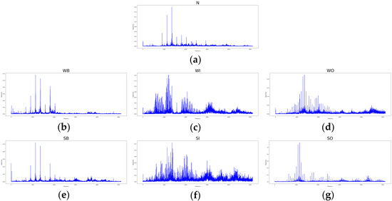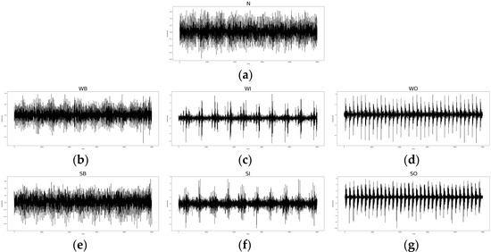 Time-domain-represented signals of (a) the normal bearing, (b) the weak ball element fault, (c) the weak inner race fault, (d) the weak outer race fault, (e) the strong ball element fault, (f) the strong inner race fault, and (g) the strong outer race fault.