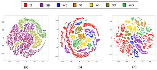 As for the feature extraction, in several previous works, manually defined features through both the time-domain and frequency-domain analysis on the raw signals have been used. In the time-domain analysis, simple statistics, including kurtosis, skewness, and crest factor, can be used as features, and those statistics from the vibration signals have been used. Meanwhile, in frequency-domain analysis, frequency-related features, including mean frequency (MF), root mean square frequency (RMSF), and frequency center (FC), are also derived from the power spectrum of the vibration signal for diagnosing the states of rotating machinery. In addition to these manually defined features, feature learning methods also have been used to extract the features from raw signals. In the feature learning methods, individual values recorded at each time point or frequency component of raw signal data are treated as variables. For this reason, a raw signal collected at a high sampling rate can be regarded as high-dimensional data, and thus, the feature learning methods entail dimensionality reduction to summarize those high-dimensional signal data into small-sized features. As shown in Table 1, PCA, one of the most representative unsupervised dimensionality reduction techniques, has been successfully used for extracting features from raw signals in FDD fields. The PCA attempts to find the optimal small dimensions to maintain as much of the covariance structures between original variables as possible. By doing so, the smaller dimensions obtained from the PCA can summarize much information on the original raw signals. However, these two feature extraction schemes are separately conducted with FDD processes, and hence, the extracted features might not be specialized to FDD tasks. Moreover, the PCA-based feature extraction techniques are linear methods, and they cannot consider the nonlinearity of input signals.