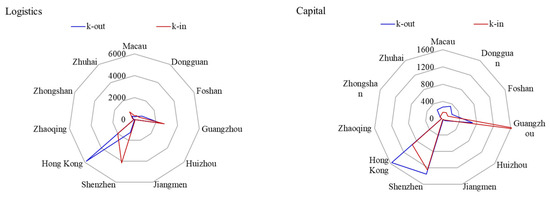 The logistics and capital flow networks in the Greater Bay Area exhibit distinct characteristics in spatial distribution and functional roles. The logistics network emphasizes extensive intercity coverage, while the capital flow network demonstrates centralized development around core cities. As shown in Figure 2, the logistics network reveals that Shenzhen and Hong Kong possess higher weighted degrees, underscoring their dominant roles in logistics output. Hong Kong, in particular, functions as an international logistics center, characterized by a significant outflow of logistics resources. Conversely, Guangdong, Foshan, and Dongguan exhibit higher weighted inwardness, indicating strong demand for logistics inputs. These regions, as manufacturing hubs, are increasingly reliant on efficient logistics systems. In the capital flow network, Hong Kong and Shenzhen are prominent in capital exports, with Hong Kong’s capital outflow reflecting its status as an international financial center. Guangzhou’s exceptionally high weighted inwardness highlights its central role in absorbing capital within the region, closely linked to the degree of industrial agglomeration and the vibrancy of business activities in the city.