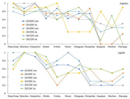 Table 2 illustrates the evolution of the logistics and capital flow networks in the Greater Bay Area from 2016 to 2021. The logistics network emphasizes balanced development, while the capital flow network increasingly centralizes, indicating differentiated resource flow and allocation patterns. First, regarding collaboration intensity among local cities, the agglomeration coefficient of the logistics network shows fluctuation; it is 0.869 in 2016, 0.819 in 2019, and 0.853 in 2021, which indicates that the regional collaboration capacity of the logistics network tends to stabilize after experiencing a certain decline in the short term. In contrast, the agglomeration coefficient of the capital flow network rises consistently, from 0.785 in 2016 to 0.819 in 2021, reflecting enhanced cooperation among cities. Second, concerning the transmission speed and cost of information and resources, the efficiency of the logistics network peaks at 0.918 in 2019 before declining, likely due to diminishing marginal efficiency from expanded logistics resource distribution. Conversely, the capital flow network’s efficiency shows continuous improvement, indicating ongoing optimization and increasing mobility in resource allocation. Third, in terms of physical connectivity, the logistics network’s density decreases annually, correlating with broader distribution and diversification within the Greater Bay Area. The capital flow network, however, becomes more cohesive, signifying heightened economic activity. This is evidenced by an increase in the logistics network’s diameter and a stable diameter in the capital flow network, indicating structural complexity in logistics and compact connectivity in capital flows. Finally, examining network centrality potential, the degree centrality of the logistics network declines from 1.5 in 2016 to 1.291 in 2021, reflecting a balance in the importance of regional cities. The capital flow network improves from 1.109 to 1.364, highlighting increased control by core cities. Regarding intermediary centrality, the logistics network remains lower than the capital flow network, which plays a more significant role for key cities, suggesting that certain cities serve as crucial intermediaries in capital flows. In terms of tight centrality, the logistics network declines annually, while the capital flow network increases to 0.770 in 2021, indicating greater efficiency in resource flow and diffusion. Overall, the logistics network exhibits a downward trend, while the capital flow network remains relatively balanced, with core cities maintaining a stable position.