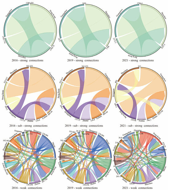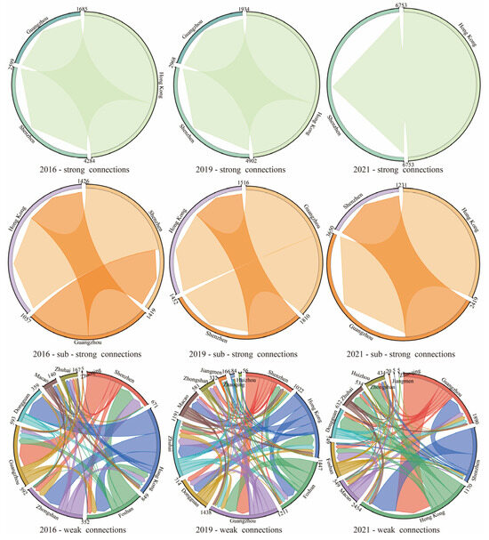 The strong linkage network denotes the most intensive core-node relationships, forming the backbone of economic, trade, and logistics activities within the region. Sub-strong linkages represent substantial intercity connections—rooted in strong relational pathways—but with relatively lower proximity and interaction strength. By contrast, weak linkages reflect sparse, low-frequency logistics flows, indicative of marginal investment and transportation activity within the Greater Bay Area. The logistics and capital flow networks across the region reveal a multi-layered hierarchical structure, exposing disparities in cities’ functional roles, resource concentration, and industrial synergy. This stratification further illustrates the organizational mechanisms and polycentric nature of the Greater Bay Area’s flow networks.
