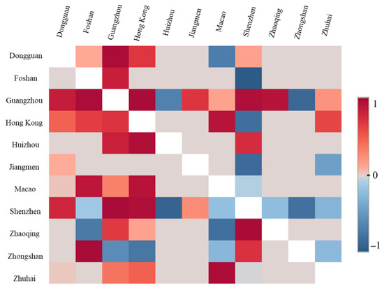 The Greater Bay Area serves as a crucial engine for China’s economic development and international trade. Intercity logistics and capital flows not only reflect the intensity of economic activity but also indicate the degree of regional integration. Analyzing these inter-city correlations reveals the division of roles and linkages among the region’s cities in supply chain management, capital flows, and industrial synergies. Figure 6 highlights significant correlations, particularly between Hong Kong-Guangzhou (0.997) and Guangzhou-Shenzhen (0.994). The correlation coefficients for these pairs of cities are close to 1, indicating a high level of synergy in logistics and capital flows among these transportation and economic centers. This strong positive correlation underscores the close cooperation between Hong Kong, Guangzhou, and Shenzhen in their economic activities, resulting in a robust industrial chain and supply chain network. Guangzhou and Shenzhen hold dominant positions in manufacturing, international trade, and high-tech industries, characterized by significant logistics and capital flow intensity. This indicates tightly linked supply chains and a high degree of capital synergy. As an international financial center, Hong Kong maintains strong links with both Guangzhou and Shenzhen, likely driven by the demand for cross-border financial services and international trade settlement.