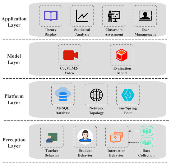 The CogVLM2-Video model-based system developed to evaluate teaching behaviors in PE classrooms comprises four core components: a perception layer, a platform layer, a model layer, and an application layer (see Figure 1). At the lowest level, the perception layer provides the interface for acquiring external information. Its primary function is to collect data on teacher and student behaviors and their interaction behaviors during classroom sessions.
