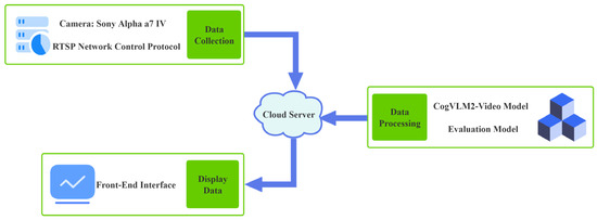 The first step of the technical implementation pathway comprises recording classroom teaching using high-resolution cameras, with video streams subsequently transmitted in a stable manner to the processing module on the cloud server via Real-Time Streaming Protocol (RTSP). The CogVLM2-Video neural network model automatically recognizes video content and classified actions, and the evaluation model processes the results, which are then displayed on the front-end interface. Multiple cameras are strategically placed in key classroom locations to achieve comprehensive coverage of teacher and student behaviors and their interaction behaviors.