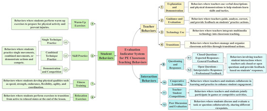 The final evaluation system included three core dimensions—teacher behaviors, student behaviors, and interaction behaviors—along with 12 secondary indicators. These indicators were explanation and demonstration, guidance and evaluation, technology use, transitions, warm-up exercises, skill practice, fitness training, relaxation exercises, questioning and responses, cooperative learning, teacher–student competitions, and peer discussion and evaluation (see Figure 4) [21].