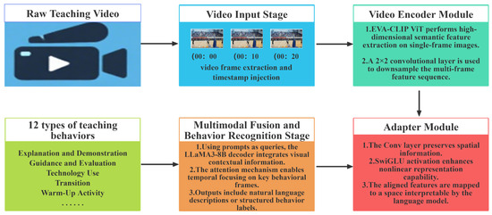 The core architecture of CogVLM2-Video is designed around multimodal video understanding. The workflow begins with frame-wise decomposition and timestamp injection, extracting key frames and assigning precise temporal markers to support subsequent temporal modeling. The visual encoder adopts a Vision Transformer based on EVA-CLIP for high-resolution feature extraction from frame images. A 2 × 2 convolutional layer is employed to compress the feature sequence length, improving computational efficiency while capturing fine-grained visual details in teaching scenes—such as blackboard explanations by the teacher or students’ physical actions. An adapter module, composed of convolutional layers and SwiGLU activation functions, aligns visual features with the input space of the language model, ensuring deep integration of visual semantics and textual instructions. The language decoder, powered by the LLaMA3-8B large language model, combines temporal embedding features and multimodal prompts to dynamically generate behavior classification labels and temporal localization outputs. For instance, it can identify events such as “the teacher begins warm-up activities at second 15” or “students engage in group training between seconds 20 and 25.”As illustrated in Figure 5, the entire system uses a cross-modal attention mechanism to optimize the interaction between spatiotemporal features and language representations. This enables not only precise localization of when teaching behaviors occur but also semantic interpretation of complex interaction scenarios. Ultimately, it forms a complete closed-loop system—from video parsing to behavior-level semantic output—offering strong technical support for automated classroom analysis and intelligent feedback.