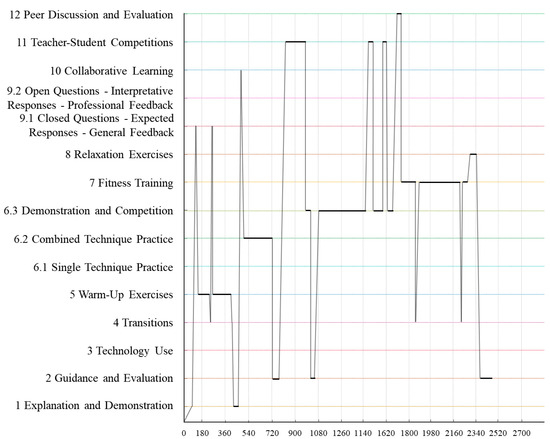 Preparation Phase (0–360 s). During the preparation phase, learning and practice activities could be categorized as two behavioral chains: 1-5 (9.1) and 1-4-5 (9.1)-2. These chains indicate that students participated in both general warm-up exercises and targeted preparatory activities, which laid a solid foundation for their subsequent learning and practice stages. The teacher provided explanations and demonstrations while conducting circulatory guidance and evaluation during students’ execution of specific preparatory exercises. The teacher also incorporated closed-ended questioning to ensure that each student received timely support and feedback.