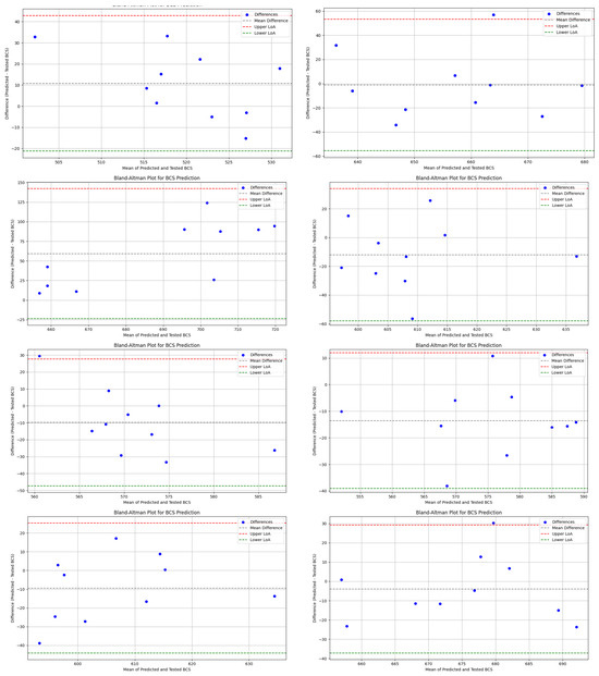 To assess the agreement between the ANN model predictions and the experimentally tested BCS values, a Bland–Altman analysis was performed. The Bland–Altman plot displays the differences between predicted and tested BCS values against their mean. For all the 10 dimensions of the box samples tested, most of the data points fell within the 95% limits of agreement (mean difference ± 1.96 × standard deviation), suggesting good consistency between the model predictions and experimental results. This analysis supports the reliability of the ANN model in predicting BCS values for box samples within the studied range. The Bland–Altman plot of each box sample is shown in Figure 15, from left to right, top to bottom, the box dimensions are: 12 × 8 × 8 in, 16 × 14 × 8 in, 16 × 16 × 8 in, 12 × 12 × 12 in, 14 × 10 × 12 in, 16 × 8 × 6 in, 16 × 10 × 6 in, 16 × 16 × 12 in, 14 × 12 × 10 in, and 12 × 12 × 10 in, respectively.