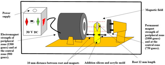 Type 2 (electromagnet): constructed from a coil of wire and an iron core (self-made). This self-made device could control the magnetic field strength by adjusting the direct current (DC) up to 30 volts (V). The polarity (on–off cycles) was defined, and the frequency was 10 times per second. Its magnetic strength (900 gauss in the central area and 1300 gauss in the peripheral area) was stronger than that of the Type 1 magnet to enhance the agitation of IONPs in the canal space. This magnet was located 10 mm from the other root side. The electromagnet was constructed from a soft iron cylindrical core measuring 6 cm in length and 2.5 cm in diameter. The coil consisted of AWG 24 enameled copper wire, conforming to approximately 1200 turns, mounted on a plastic spool. The DC power supply was 24 V DC. The operating current was typically maintained between 0.5 and 1 ampere. The magnetic strength between them was identified using a handheld digital gaussmeter device (Tunkia, Co., Ltd., Changsha, Hunan, China) provided by the Scientific Research Authority, Ministry of Higher Education and Scientific Research, Baghdad, Iraq. The magnetic strength at the root position between them was 450 gauss, measured using a gaussmeter device by calibrating the device probe at an intermediate distance between the center of each magnet, representing the root specimen.