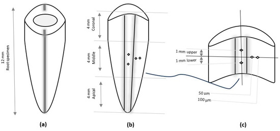 A schematic diagram of root canal preparation: (a) single root specimen with two longitudinal grooves, (b) one-half of the splitting of the root with canal lumen, and (c) the middle section with four identical Vickers microhardness points.