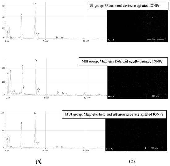 When comparing the Ca/P ratios of the irrigant groups after using different protocols with no treatment of the control group, the Ca/P ratio of the IONPs irrigant group was higher than that of the EDTA group. The UN group (ultrasound device, agitated normal saline irrigant) had the lowest concentration of iron ions, followed by the MUI group (magnetic field and ultrasound device, agitated IONPs irrigant). There was a high concentration in the MSI group (magnetic field and endodontic needle). The data are shown in Table 5.