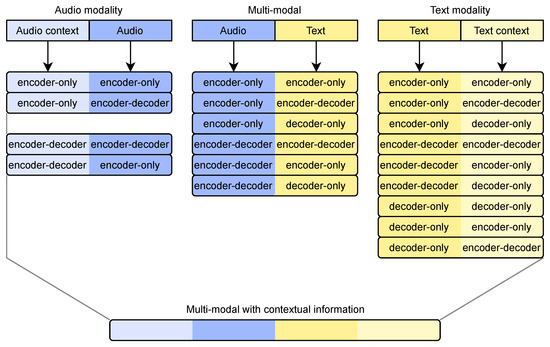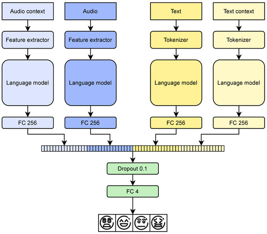 After training the baseline models, the model with the best validation AU in the text modality was selected for each category. In the audio modality, where no decoder-only model was used, the best encoder-only model and the best encoder-decoder model (using only the encoder part in this experiment) were selected. With the selected models, the effect of adding contextual information was investigated by combining different models or by using two copies of the same model, one for the utterance and one for the contextual information. In addition, the combination of models from different modalities was explored. Based on the results of this experiment, a multimodal model was assembled that included contextual information (see Figure 2). The decision to compare only models of different architectures and modalities was made for two main reasons. First, the number of combinations that would result from testing the 19 base models would be prohibitively large. Second, ensemble models often tend to perform better when combining features that are significantly different from each other, as diversity among classifiers has been shown to be a key factor in ensemble performance [74].