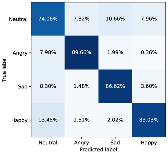 The proposed ensemble model showed a WA of 82.12% and a UA of 83.34%. Figure 3 shows the confusion matrix combined from the 5 folds, where the lowest accuracy corresponds to the neutral class (74.06%) and the highest to the angry class (89.66%). The model showed rapid convergence, reaching its maximum validation accuracy after an average of only 2.2 epochs. In addition, it achieved a WA of 80.11% and a UA of 81.68% after only one epoch. Furthermore, it is important to highlight the stability of the results, WA remained above 80% and UA above 81.5% during the first 4 epochs. Due to the early stopping criterion used, results are only available for the first 4 epochs in the 5 folds. However, in cases where training extended beyond this range, such as the fold that used session 1 as the validation set, where training stopped at epoch 7, both WA and UA metrics remained stable over the 7 epochs, with standard deviations of 1.4% for both metrics.