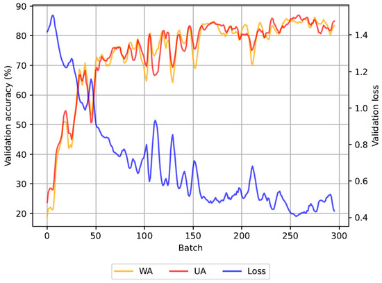 Training and validation of the different models was done by 5-fold cross-validation, where 4 sessions in each fold were used for training and the remaining session was used for validation. All SLMs were initialized with the pre-trained weights available from Hugging Face (https://huggingface.co/, accessed on 12 January 2025). Given that these models are pre-trained, a low learning rate () was chosen. In addition, a small batch size of 12 was chosen and an early stopping mechanism was applied to prevent overfitting. This mechanism consisted of stopping the training process if there was no improvement in the validation unweighted accuracy (UA) after 3 epochs. Furthermore, a maximum of 20 epochs was set for the training duration. In addition, the loss function was weighted by class weights (inversely proportional to class size) to compensate for the effect of class imbalance of the IEMOCAP dataset.