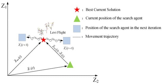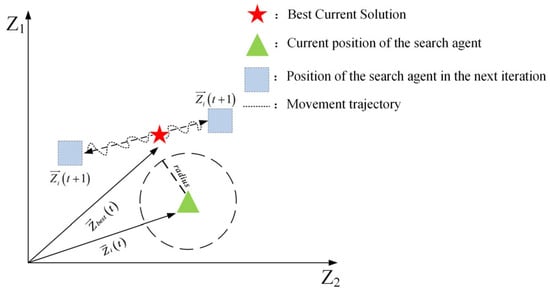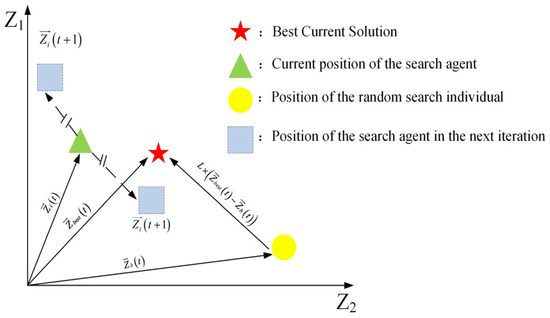 where denote the position of the search agent during iteration ,while indicates the current global optimum solution. The direction control parameter , calculated as in Equation (5), facilitates exploration by periodically altering the search trajectories to escape local optima. The stochastic component implements Brownian motion with step sizes derived from a normal distribution—see Equation (4)—enabling dynamic space exploration. Additionally, represents a uniformly distributed random vector [−1,1] (where d is the problem dimensionality), generated via Equation (6), which enhances the solution space coverage. denotes the position vector of the search agent, while represents a randomly chosen individual from the population. The integer parameter a is between 1 and . governs the directional movement between the current optimal solution and randomly selected individuals, mathematically characterizing the inter-agent interactions during migration. The two-dimensional mathematical representation of this long-distance migration mechanism is depicted in Figure 3.