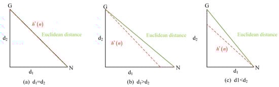 The search performance of the hybrid A* algorithm is influenced by the heuristic . When is closer to the true cost, the total computational cost decreases, and the search efficiency improves. However, in practice, it is difficult to accurately estimate the value of . The Manhattan distance, which is the sum of the horizontal and vertical distances, is often much larger than the actual distance, while the Euclidean distance, representing the straight-line distance between two points, does not account for the realistic constraints of vehicle movement. Therefore, a middle value between the Manhattan distance and the Euclidean distance can be adopted as the heuristic estimate . In Figure 7, the diagonal segment represents the Euclidean distance, while the dashed segment denotes an intermediate value between the Manhattan distance and the Euclidean distance. The improved H(n) estimate is illustrated in Figure 7.