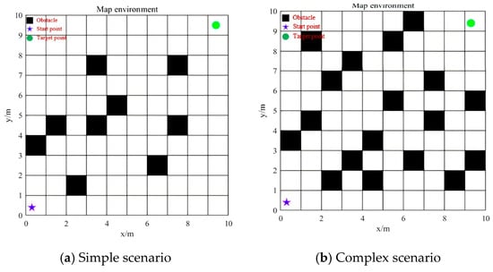 This study constructed two different types of grid maps (complex scenario and simple scenario), as shown in Figure 10, where both maps have dimensions of 10 × 10 (scaled proportionally). The pentagram in the bottom-left corner served as the starting point (0.3, 0.4); the green circle in the top-right corner was the target point (9.3, 9.4); black squares represent obstacle zones, while white grids indicate obstacle-free zones. The obstacle coverage rate in the simple scenario was 9%, while that in the complex scenario was 18%.