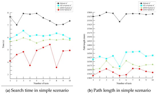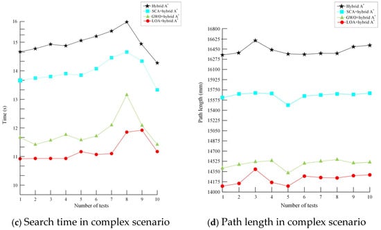 Next, for the SCA optimization algorithm, in the simple scenario, the average planning time was 6.74 s and the average path length was 14,422.9 mm. Compared with the traditional hybrid A* algorithm, the average search time was reduced by 8.7% and the average path length was reduced by 8.3%. Meanwhile, in the complex scenario, the average planning time was 14.01 s and the average path length was 15,700.0 mm. Compared with the traditional hybrid A* algorithm, the average search time was reduced by 8.7% and the average path length was reduced by 8.3%.