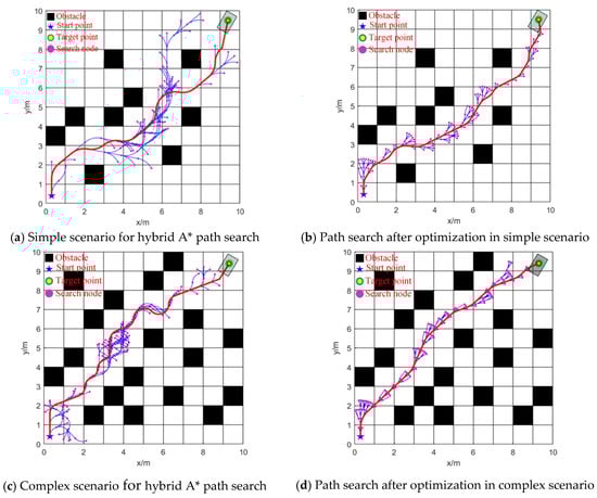 As shown in Table 10, the traditional hybrid A* algorithm has the highest average planning time and average path length values in both the simple and complex scenarios, with average times of 7.39 s and 14.79 s and average lengths of 15,730.5 mm and 16,421.2 mm. This is because the traditional hybrid A* algorithm has high computational complexity and poor real-time performance.