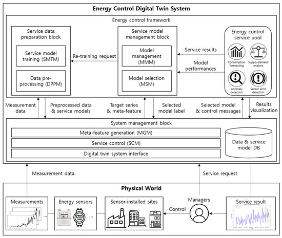 The overview of the proposed energy control digital twin system is illustrated in Figure 1. The figure shows the end-to-end workflow: from energy data collection, through the digital twin control system, to energy management services delivered to users. The figure consists of two parts: the physical world and the proposed energy control system. In the physical world where the energy sensors and sensor-installed sites exist, the energy sensors collect energy data such as energy usage, sensor state from sites such as factories, buildings, and offices, and they transfer the data to the near-edge server. The managers request the energy control service for the system, get service results, and optimally control the sites. The proposed system takes the measurement data and service requests as input. The system preprocesses raw measurements and stores them in the data repository. The service model is trained offline on these data. A meta-feature that can be used as the selection criterion to select the optimal service model is created with measurement data and the service model information. Our scheduler queries the OS for available CPU cores and current CPU quota usage and then selects the model whose worst-case inference time fits within the measured budget. Finally, the system visualizes the service results and updates the models based on feedback.