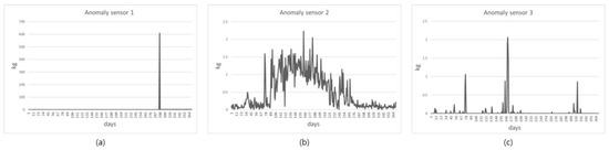 Examples of daily measurements of LPG usage over a year in three different places. (a) shows an example of isolated spike which may indicate an equipment malfunction; (b) is a certain period of fluctuation, reflecting abnormalities; (c) shows several spikes and sporadic anomalies.