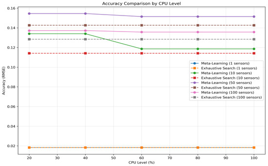 Comparison of the forecasting accuracy (RMSE) between the proposed meta-learning method and exhaustive search across different CPU availability levels (20–100%) and sensor concurrency scenarios (1, 10, 50, and 100 sensors).