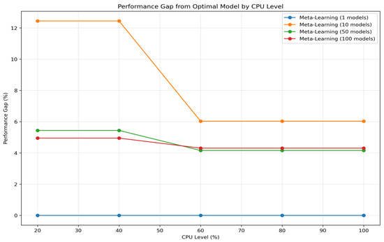 The model selection time for the meta-learning framework remained consistently low, completing within approximately 1–2 milliseconds across all CPU levels and sensor request sizes. However, a slight increase in selection time was observed at higher CPU availability levels. This minor variation is unlikely to stem from the model selection logic itself, given its inherently lightweight and rapid design. Instead, it is more plausible that the increase is caused by background processes running on the system’s operating environment. As CPU resources become more available, non-critical background software and system management tasks might opportunistically utilize the excess capacity, leading to subtle but measurable delays in the overall timing of the selection process. Despite this, the impact remains negligible in practice, as the selection time is orders of magnitude shorter than the inference time or total service time.
