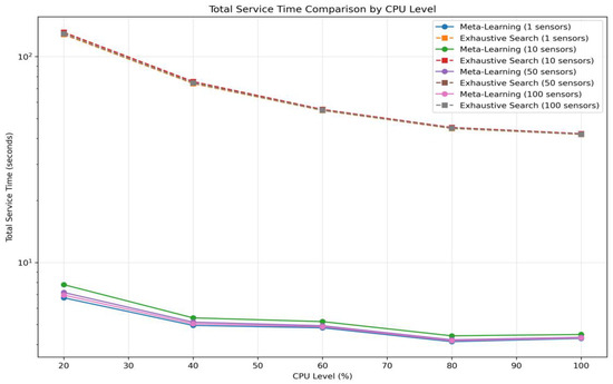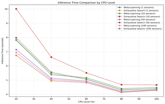 Figure 6 shows the model selection time for both the proposed meta-learning framework and the exhaustive search baseline. The meta-learning approach completed model selection within 0–3 milliseconds across all CPU levels and sensor request sizes. In contrast, the exhaustive search method showed significant selection delays over 100 s, regardless of CPU availability or concurrency level, due to the need to evaluate every model candidate sequentially. This performance gap directly results from the brute-force nature of exhaustive search, which evaluates all candidate models for each sensor sequentially.