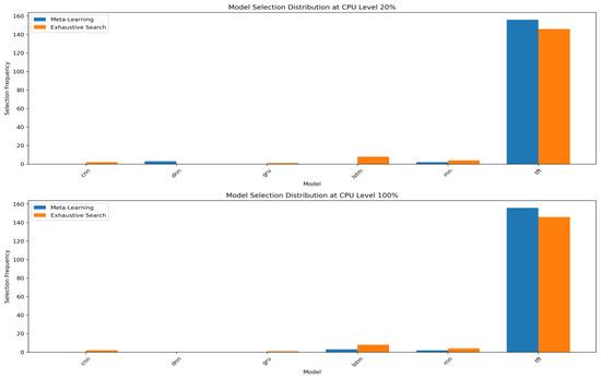 To further understand the behavior of the proposed model selection system, we analyzed the distribution of selected forecasting models at different CPU availability levels. In Figure 9, at both low (20%) and high (100%) CPU levels, the majority of the selected models were TFT, reflecting its high forecasting accuracy in many sensor cases. Interestingly, the meta-learning approach consistently favored TFT, even with low-resource settings, indicating its strong bias toward accuracy over computational cost, which is consistent with our design intent. In contrast, the exhaustive search occasionally selected alternative models such as LSTM and RNN, which may have yielded marginal improvements in latency at the cost of a slight accuracy loss.